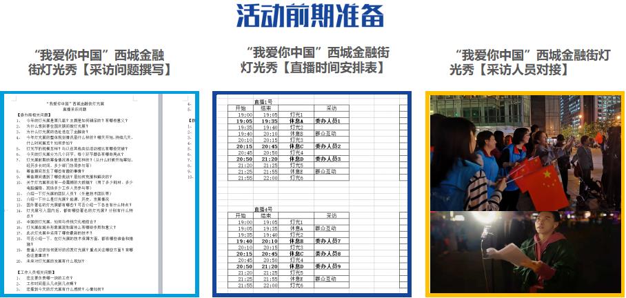 每天直播时长为3小时,三天的直播累计达到9小时。为了使“看秀”不枯燥,运营团队制定了缜密的直播计划。灯光秀启动后,主播口播与采访交替不间断,除了为直播观众带来美的享受之外,还带来了知识“套餐”。
