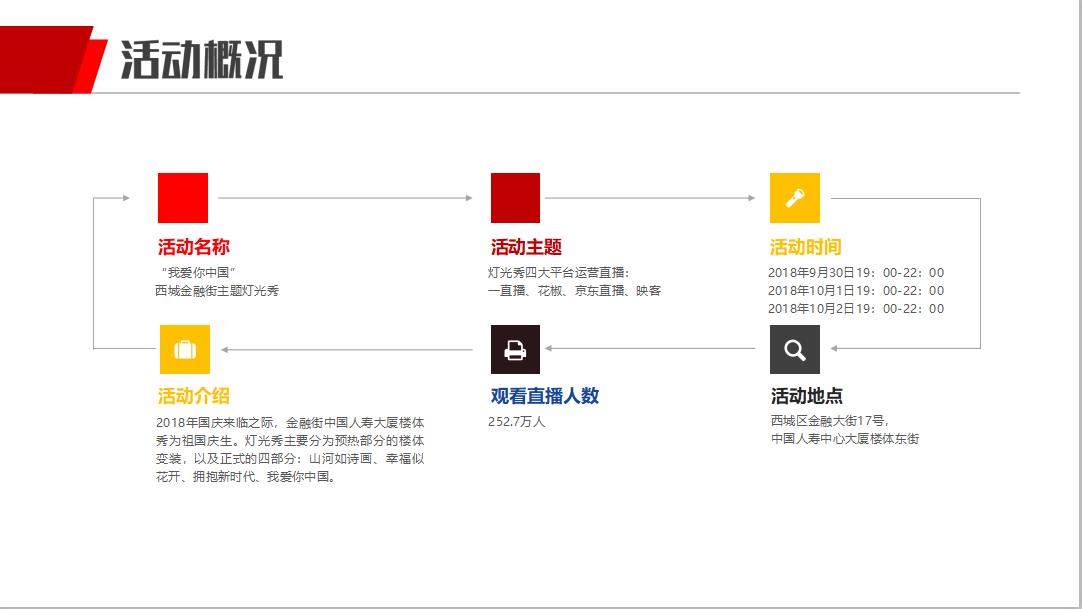 2018年国庆来临之际,为了渲染节日气氛,为祖国母亲庆生,金融街中国人寿大厦楼体上演了美轮美奂的灯光秀。如何让灯光秀跳脱出地域的限制,让更多的人观看到?政新科技运营团队运用直播的形式,通过一直播、花椒、京东直播、映客四大平台,使三天的观看人数达到252.7万人。