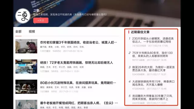 从上图右侧“最佳文章”列表中,可以看出“二更”在头条号上阅读量动辄几十万上百万的文章标题,字数较多,并且意义具体,基本上用户看了标题就知道内容在讲什么了。